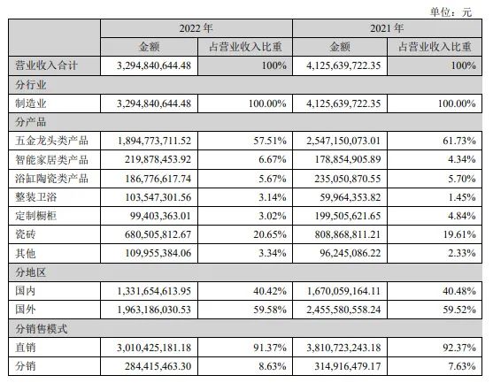 浴缸陶瓷类产品营业收入18,677.66万元;五金龙头类产品营业收入189,477.37万元;智能家居营业收入21,987.85万元。
