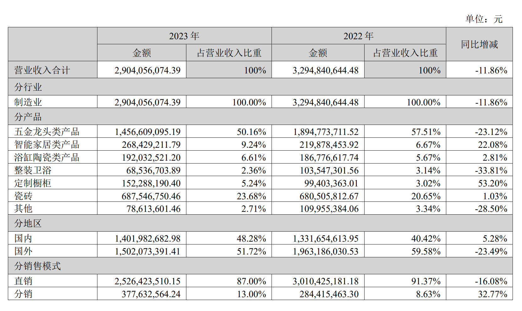 2023年,海鸥住工五金龙头类产品营收同比下滑23.12%至14.57亿元;智能家居类产品营收同比上升22.08%至2.68亿元;浴缸陶瓷类产品营收同比上升2.81%至1.92亿元;整装卫浴营收同比下滑33.81%至6853.67万元;定制橱柜营收同比上升53.20%至1.52亿元;瓷砖营收同比上升1.03%至6.88亿元。