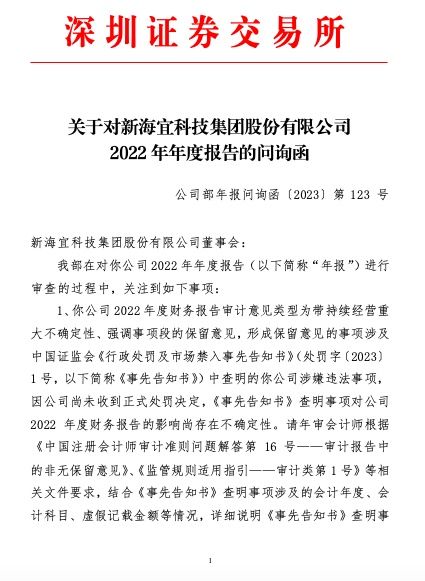 5月12日,新海宜科技集团股份有限公司(以下简称“*ST新海2022年年度报告的问询函,问询函要求*ST新海详细说明中国证监会《行政处罚及市场禁入事先告知书》查明事项对公司2022年度财务报告的影响是否具有广泛性,是否存在以保留意见替代无法表示意见或否定意见的情形;充分提示相关资产存在因公司无法偿还到期债务而被司法拍卖风险;说明国家税务总局苏州工业园区税务局稽查局对公司出具的《税务处理决定书》查明*ST新海涉嫌违法的事实内容,说明未对相关行政处罚进行及时披露的原因及相关责任人员等。