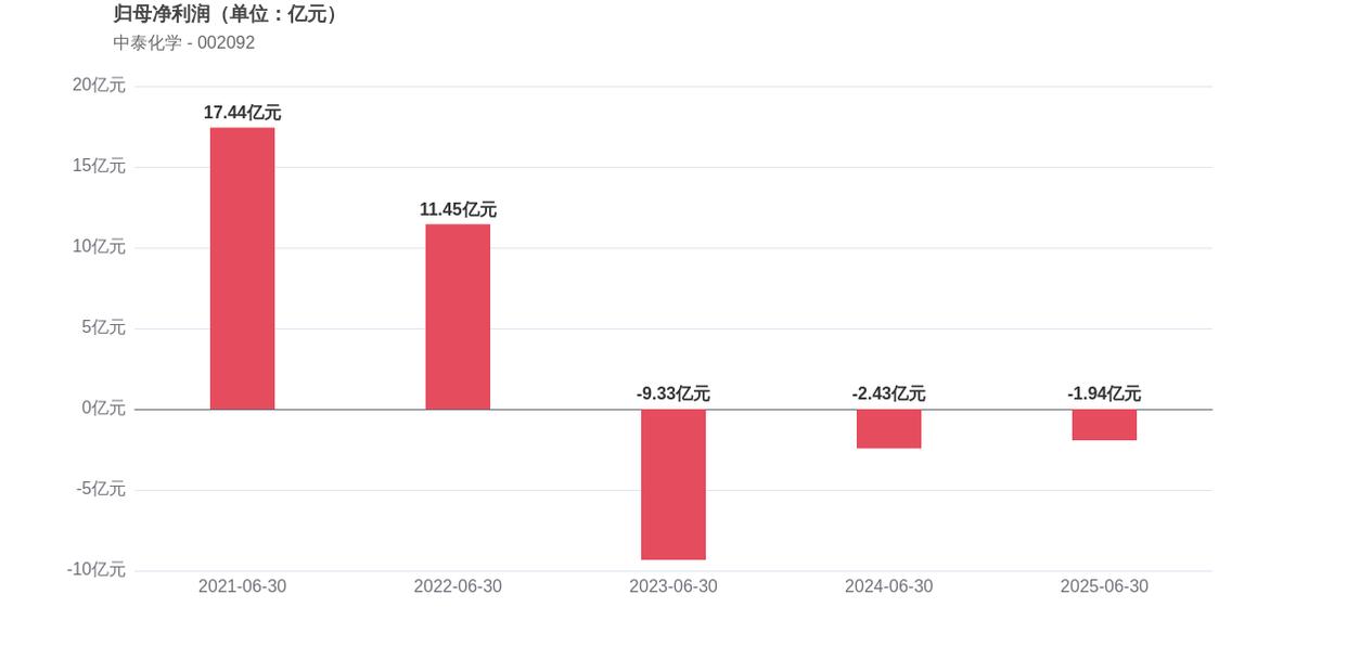 在2025年上半年,中泰化学的经营业绩呈现收入下滑但亏损收窄的态势,实现营业收入139.55亿元,同比下滑8.32%;实现归母净利润-1.94亿元,同比增长20.0%。引人关注的是,公司已经连续3年中报出现亏损,显示出持续的盈利压力。