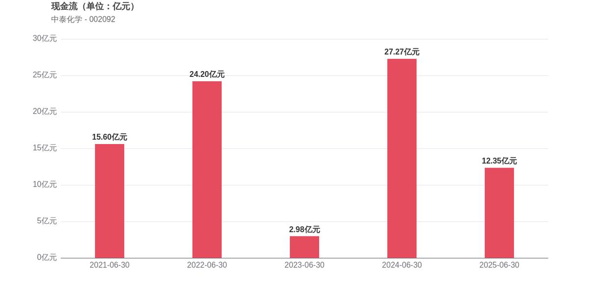 在经营稳健性方面,中泰化学面临库存管理效率下降的挑战,存货周转天数为47.84天,较去年同期增长了6.1%,表明公司在产品销售和库存控制方面承受一定压力。经营活动产生的现金流净额为12.35亿元,相比2024年同期的27.27亿元大幅下滑54.70%,显示出现金创造能力的明显减弱。此外,2025年上半年的资产负债率为64.85%,同比增长了3.49个百分点,这意味着公司债务负担有所加重。