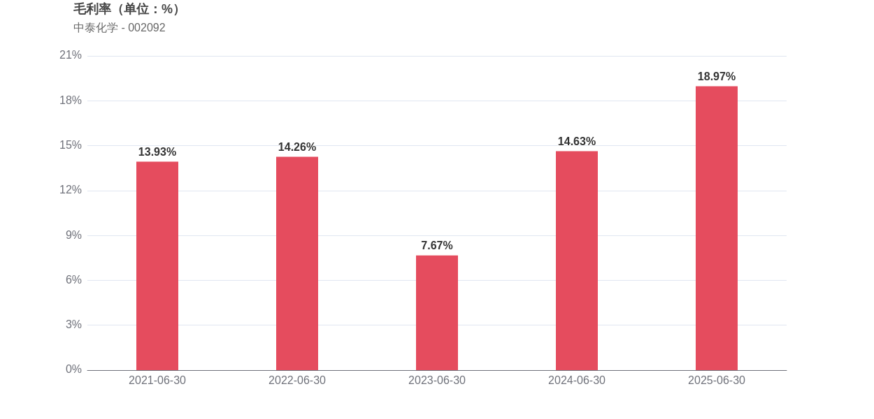 从反映盈利质量的指标来看,中泰化学的净利率由2024年上半年的-2.15%提升至-1.67%,毛利率从14.63%提升至18.97%,净资产收益率为-0.90%,各项指标均有所改善。