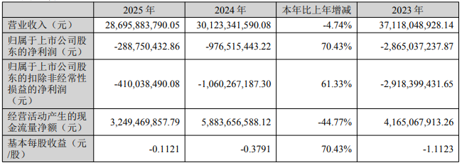 BDO研究院报道,中泰化学(002092.SZ)发布2025年年度报告,该公司营业收入为286.96亿元,同比减少4.74%。归属于上市公司股东的净亏损为2.89亿元,同比收窄70.43%。归属于上市公司股东的扣除非经常性损益的净亏损为4.1亿元,同比收窄61.33%。基本每股亏损为0.1121元。