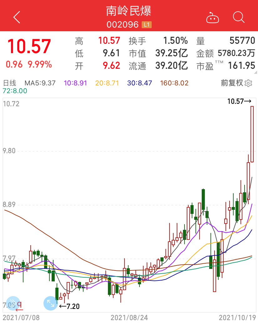 值得注意的是,南岭民爆停牌前两个交易日均获得大涨,10月18日涨幅达到7.49%,10月19日涨停,涨幅为9.99%。