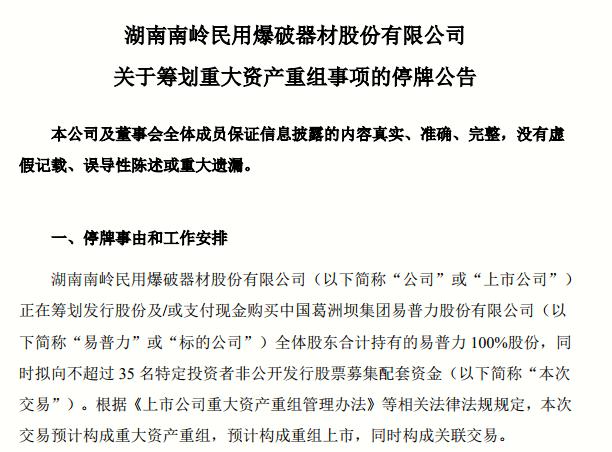 近日,南岭民爆发布公告称,公司正在筹划发行股份及/或支付现金购买中国葛洲坝集团易普力股份有限公司全体股东合计持有的易普力100%股份,同时拟向不超过35名特定投资者非公开发行股票募集配套资金。本次交易预计构成重大资产重组,预计构成重组上市,同时构成关联交易。公司股票自2021年10月20日开市时起停牌。