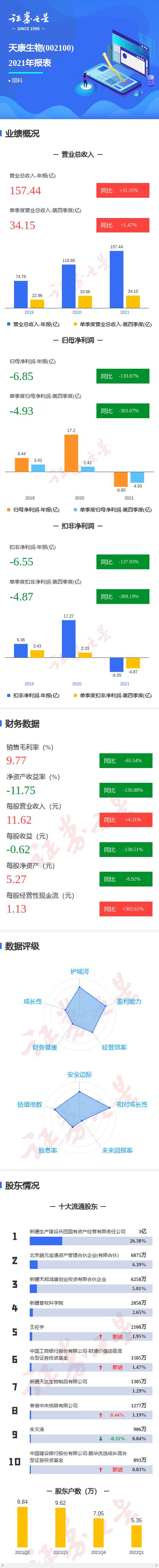 天康生物2021年报显示,公司主营收入157.44亿元,同比上升31.35%;归母净利润-68596.45万元,同比下降139.87%;扣非净利润-65529.18万元,同比下降137.93%;其中2021年第四季度,公司单季度主营收入34.15亿元,同比上升1.47%;单季度归母净利润-49310.53万元,同比下降303.07%;单季度扣非净利润-48748.81万元,同比下降309.19%;负债率54.71%,投资收益2953.32万元,财务费用1.92亿元,毛利率9.77%。