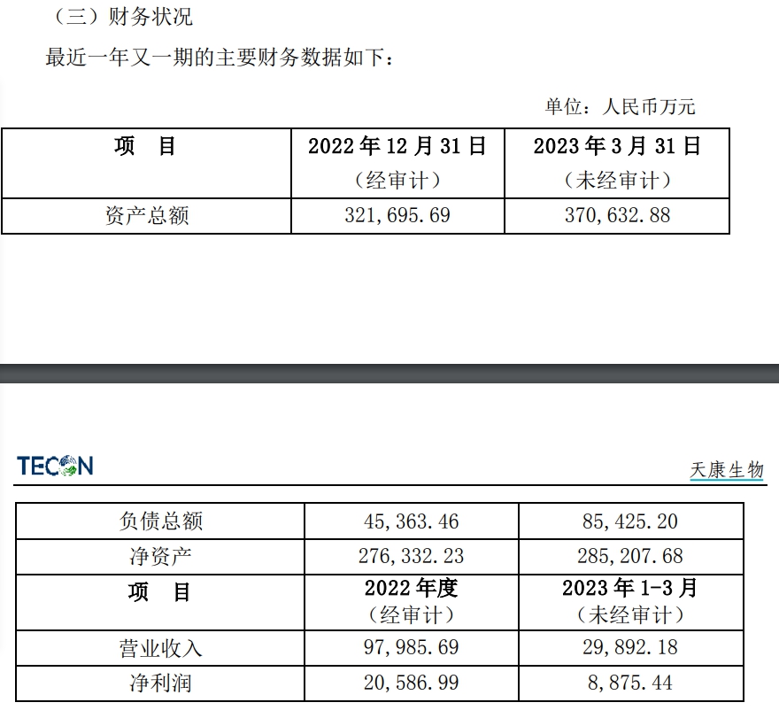 据天康生物此前公告披露,天康制药成立于2018年3月22日,注册资本为25450.145万元,经营范围包括兽药生产、兽药经营、技术服务、技术开发等。2022年及2023年一季度,天康制药分别实现营收9.8亿元和2.99亿元,净利润达到2.06亿元和0.89亿元。