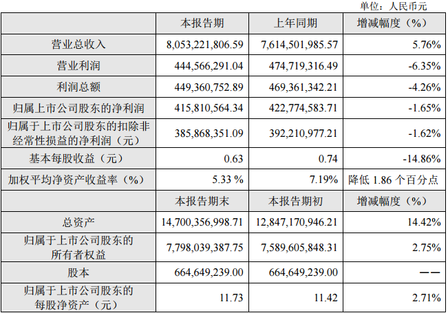 报告期末公司财务状况稳定,持续经营能力良好。截至2024年12月31日,公司总资产1,470,035.70万元,较2024年年初增长14.42%;归属于上市公司股东的所有者权益779,803.94万元,较年初增长2.75%;每股净资产11.73元,较年初增长2.71%。