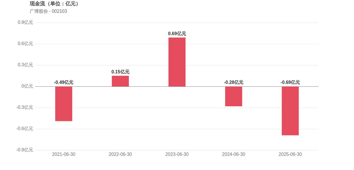 在经营稳健性方面,广博股份面临营运效率和现金流双重压力,存货周转天数增至30.30天,较2024年上半年增长0.5%。经营活动产生的现金流净额为-0.69亿元,较2024年同期的-0.28亿元进一步恶化,显示出公司在资金回笼方面仍存在挑战。此外,2025年上半年的资产负债率为46.40%,同比下降0.15个百分点,这意味着公司负债结构有所优化。