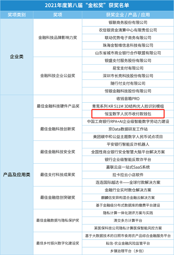 2021年度第八届“金松奖”金融科技行业评选结果新鲜出炉啦~超百家企业164个项目激烈角逐,31个奖项尘埃落定,恒宝股份数字人民币收付款钱包荣获“最佳金融科技硬件产品奖”。