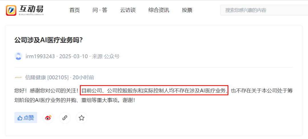 3月12日,信隆健康在深交所互动易平台上表示,“公司及控股股东、实际控制人不存在涉及AI医疗业务及各类机器人业务的并购重组重大事项。”