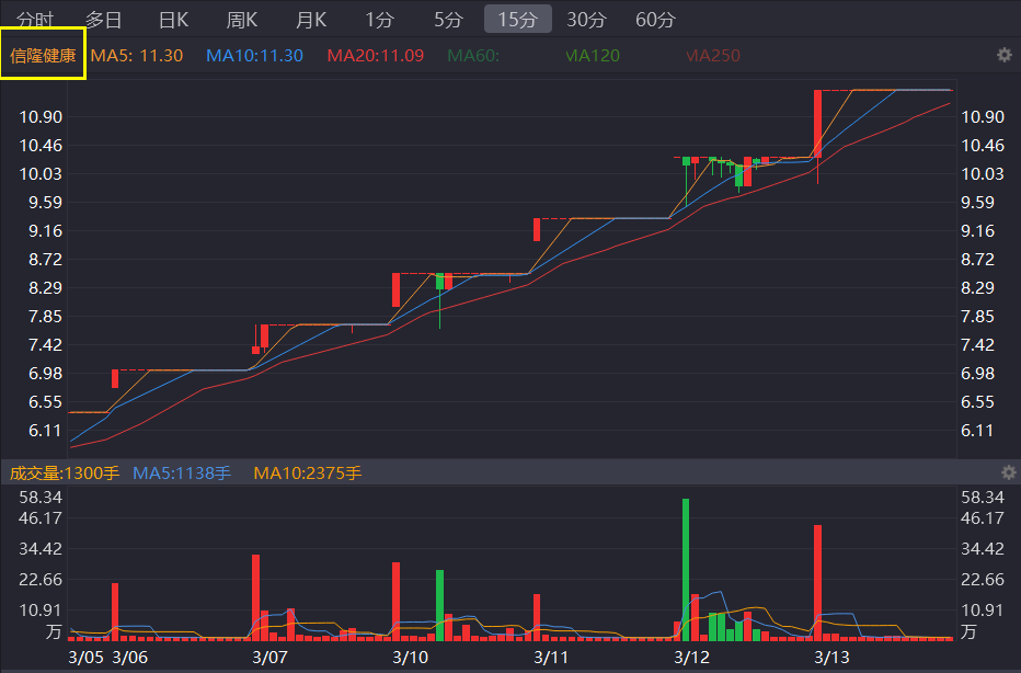 信隆健康(002105)的股票近日连收8个涨停板,股价从3月3日的7.44元飙升至3月13日的11.30元,累计涨幅高达51.7%。这样的涨幅,放在任何一只股票身上,都是令人侧目的。