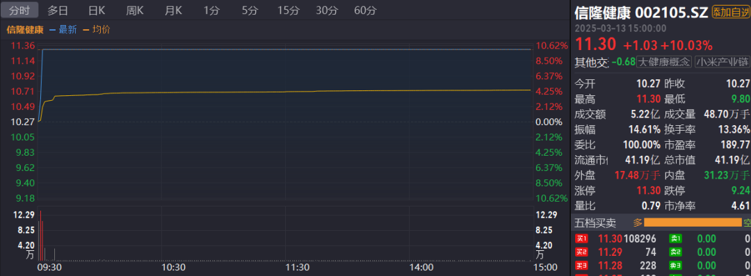 3月13日,信隆健康开盘后迅速涨停,截至收盘,股价报11.30元,换手率11.69%,成交量4261.63万股,成交金额4.53亿元,涨停板封单金额达3.12亿元。