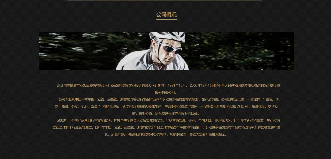 信隆健康创立于1991年10月,主要从事自行车零配件、运动器材、康复辅助器材的研发、生产及销售。公司是全球最大的自行车零配件生产厂商之一,其车把、立管、坐垫管、避震前叉等产品全球市场占有率排名第一。