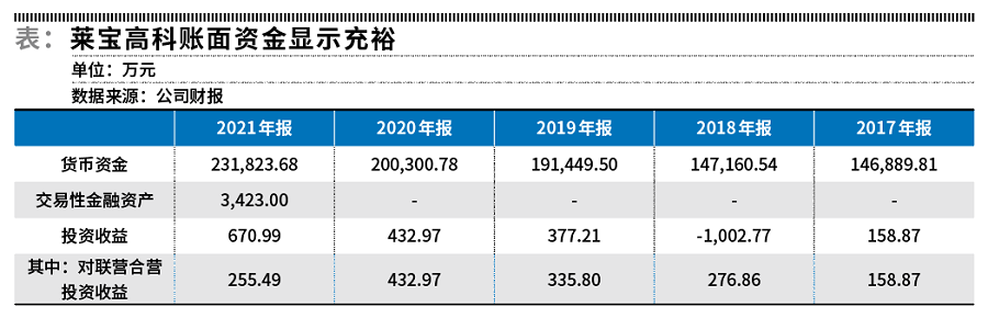 莱宝高科上市15年以来,除了极个别年份外,几乎没有长短期借款。2021年年报显示,公司账面资金高达23亿元。