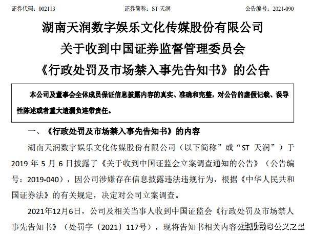 2021年12月8日,ST天润(天润数娱002113)公告因违规担保及资金占用及未按时披露重大信息等收到中国证监会《行政处罚及市场禁入事先告知书》(处罚字〔2021〕117号)。