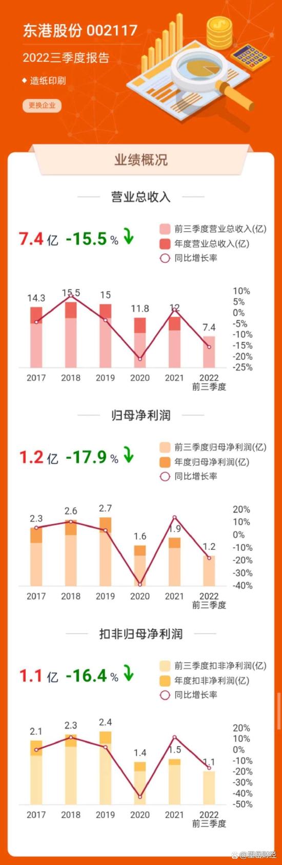 近日,东港股份(002117.SZ)发布了2022年三季度报称,今年Q3,公司实现营收2.39亿元,同比降低13.82%,实现归母净利润0.41亿元,同比下降25.23%,扣非净利润为0.38亿元,同比下降23.63%。