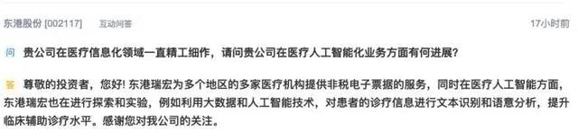 还有投资者在投资者互动平台问道:公司在医疗信息化领域一直精工细作,请问贵公司在医疗人工智能化业务方面有何进展?东港股份表示,东港瑞宏为多个地区的多家医疗机构提供非税电子票据的服务,同时在医疗人工智能方面,东港瑞宏也在进行探索和实验,例如利用大数据和人工智能技术,对患者的诊疗信息进行文本识别和语意分析,提升临床辅助诊疗水平。