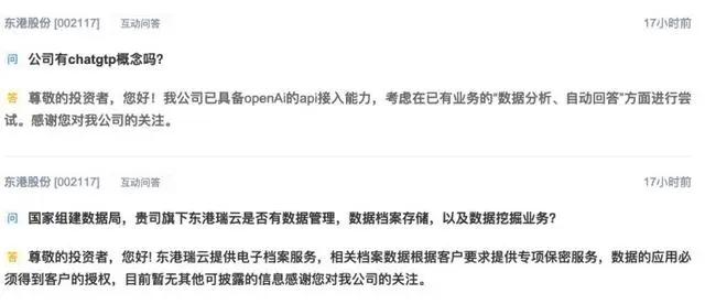 近日有投资者在投资者互动平台提问:公司是否有chatgtp概念?东港股份3月11日回复表示,公司已具备Open AI的API(应用程序接口)接入能力,考虑在已有业务的“数据分析、自动回答”方面进行尝试。