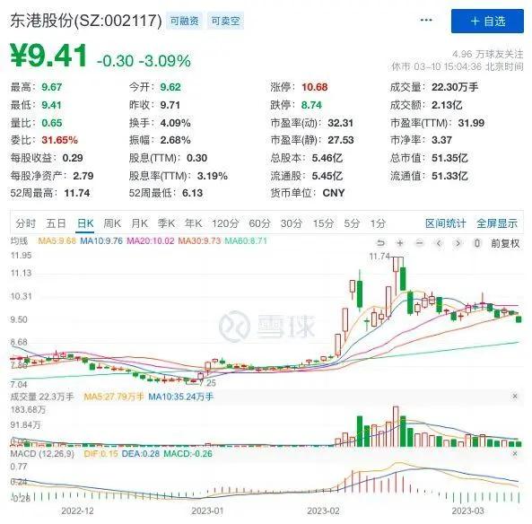 3月10,东港股份收报9.41元/股,跌幅3.09%,最新总市值51.35亿元。