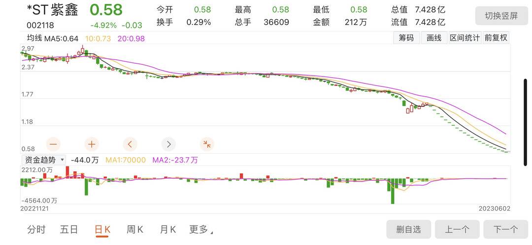 6月2日,*ST紫鑫开盘再度跌停,截至收盘,股价已下探至0.58元,总市值仅剩7.4亿元。这也是*ST紫鑫近期连续第21个跌停。