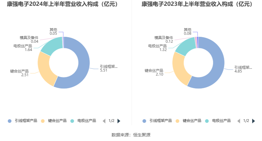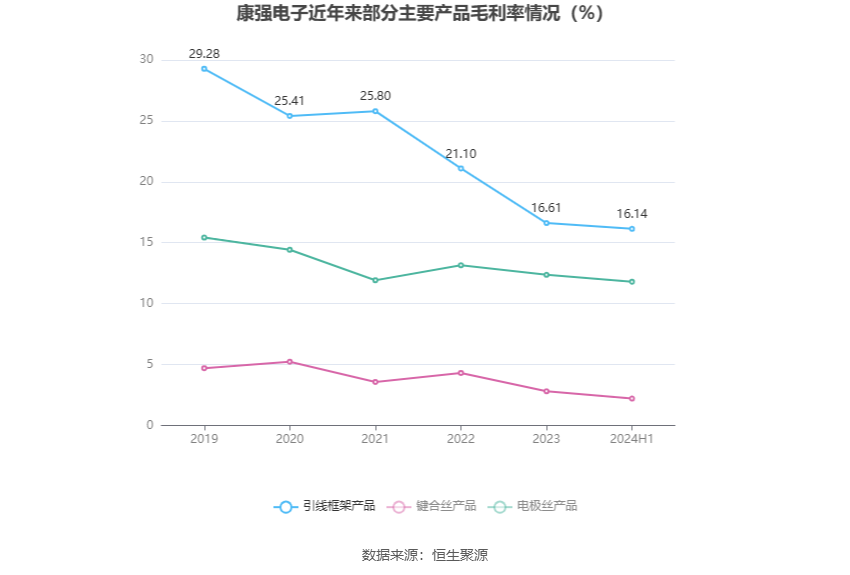 分产品看,引线框架产品、键合丝产品、电极丝产品2024年上半年毛利率分别为16.14%、2.20%、11.80%。