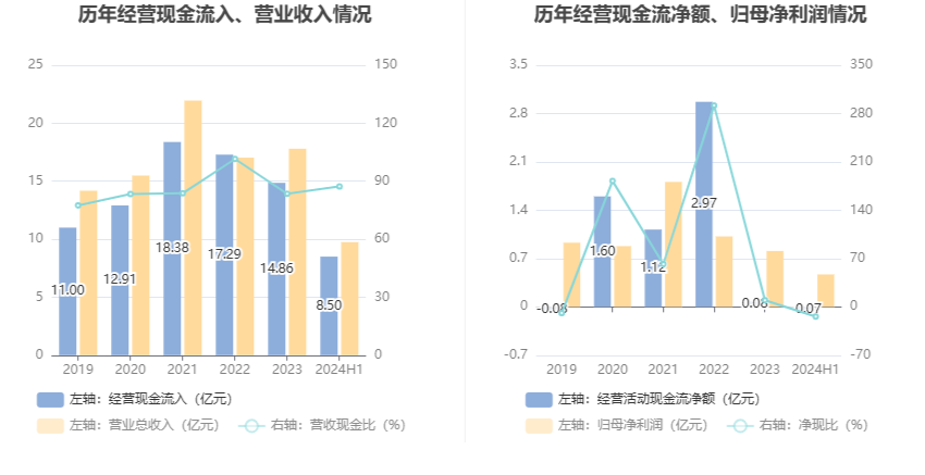 2024年上半年,公司营业收入现金比为87.25%,净现比为-13.99%。