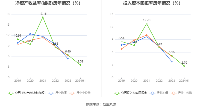 盈利能力方面, 2024年半年度公司加权平均净资产收益率为3.58%,同比下降0.13个百分点。公司2024年上半年投入资本回报率为2.7%,较上年同期下降0.04个百分点。