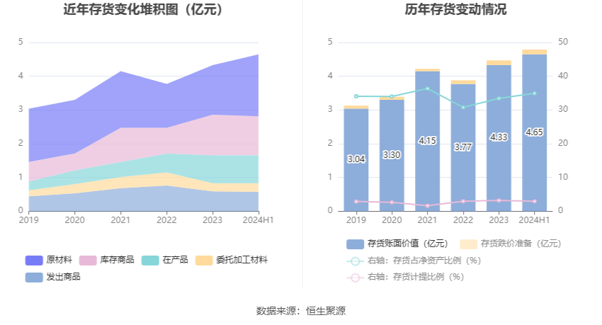 从存货变动来看,截至2024年上半年末,公司存货账面价值为4.65亿元,占净资产的34.94%,较上年末增加3204.23万元。其中,存货跌价准备为1396.71万元,计提比例为2.92%。