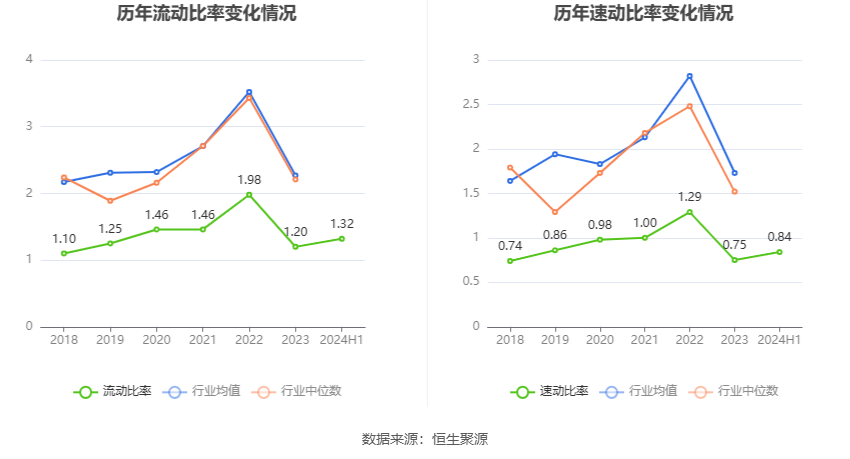 2024年上半年,公司流动比率为1.32,速动比率为0.84。