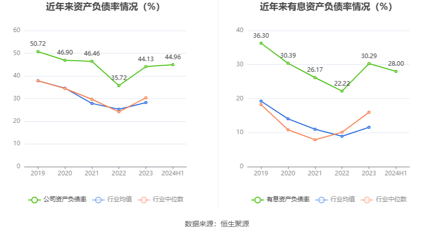 在偿债能力方面,公司2024年上半年末资产负债率为44.96%,相比上年末上升0.83个百分点;有息资产负债率为28.00%,相比上年末下降2.29个百分点。