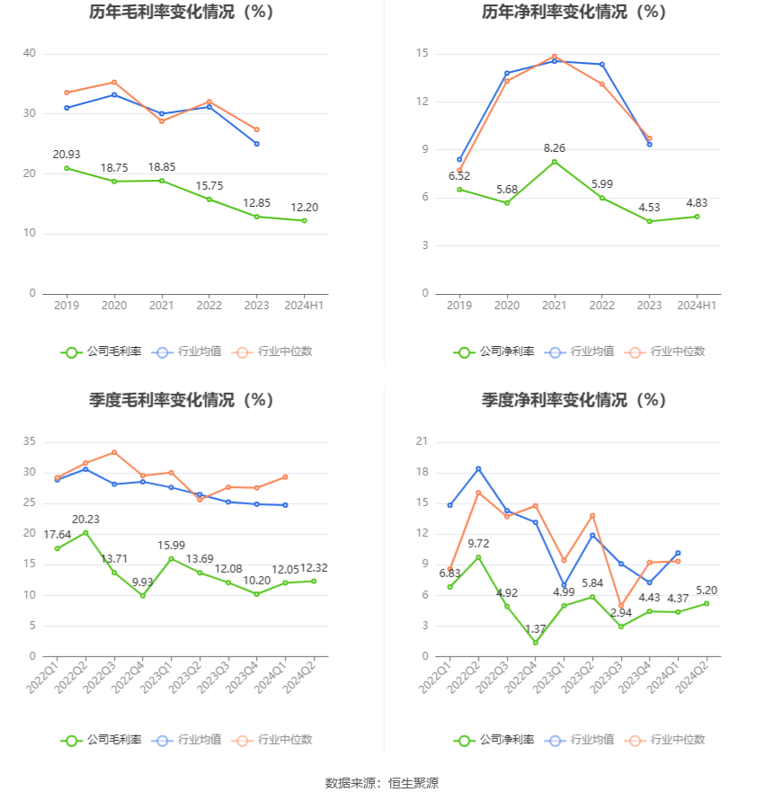 2024年上半年,公司毛利率为12.20%,同比下降2.54个百分点;净利率为4.83%,较上年同期下降0.62个百分点。从单季度指标来看,2024年第二季度公司毛利率为12.32%,同比下降1.37个百分点,环比上升0.27个百分点;净利率为5.20%,较上年同期下降0.64个百分点,较上一季度上升0.83个百分点。