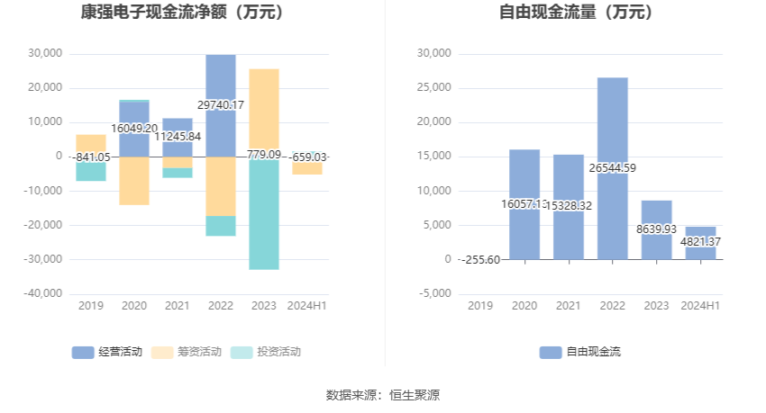 进一步统计发现,2024年上半年公司自由现金流为4821.37万元,相比上年同期下降10.53%。