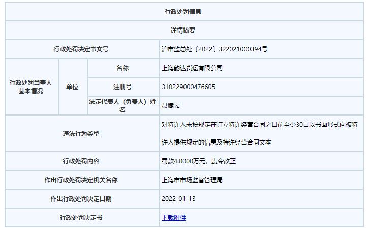 中国经济网北京1月25日讯近日,上海市市场监督管理局发布行政处罚决定书(沪市监总处〔2022〕322021000394号)。上海韵达货运有限公司存在以下违法行为:对特许人未按规定在订立特许经营合同之日前至少30日以书面形式向被特许人提供规定的信息及特许经营合同文本。上海市市场监督管理局对其处以罚款4万元,责令改正。