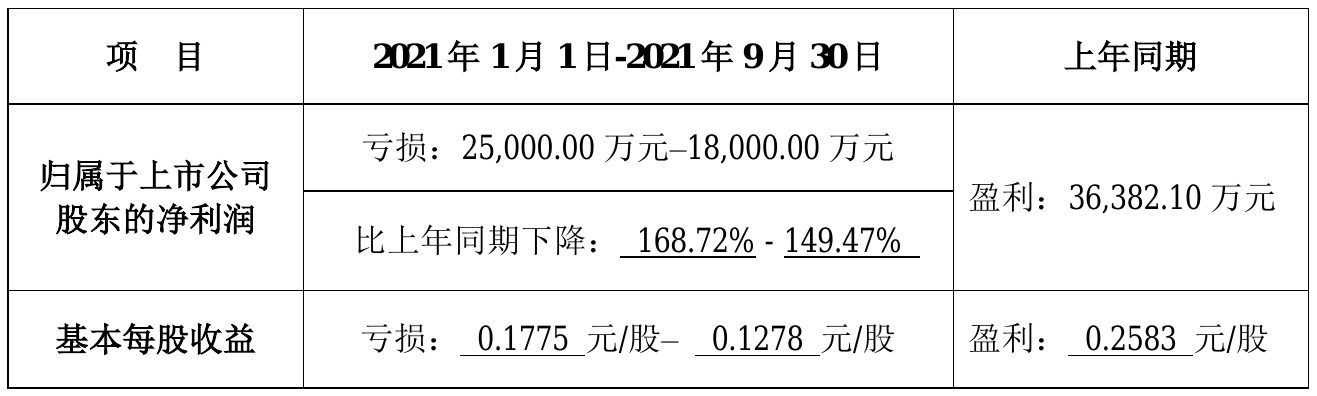 10月14日,科陆电子(002121)近日发布2021年前三季度业绩预告公告,预计2021年前三季度实现归属于上市公司股东的净利润为亏损25000.00万元–18000.00万元,同比由盈转亏。
