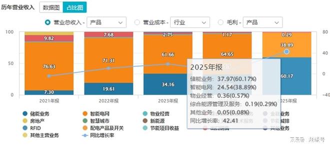 站在风口上的储能业务,才是科陆电子现阶段的发展核心。2025年储能业务实现后来者居上,首次成为科陆电子的第一大业务,营收占比高达60.17%。全年科陆电子储能业务收入突破37.96亿元,同比增长超160.74%,远高于行业平均增速。