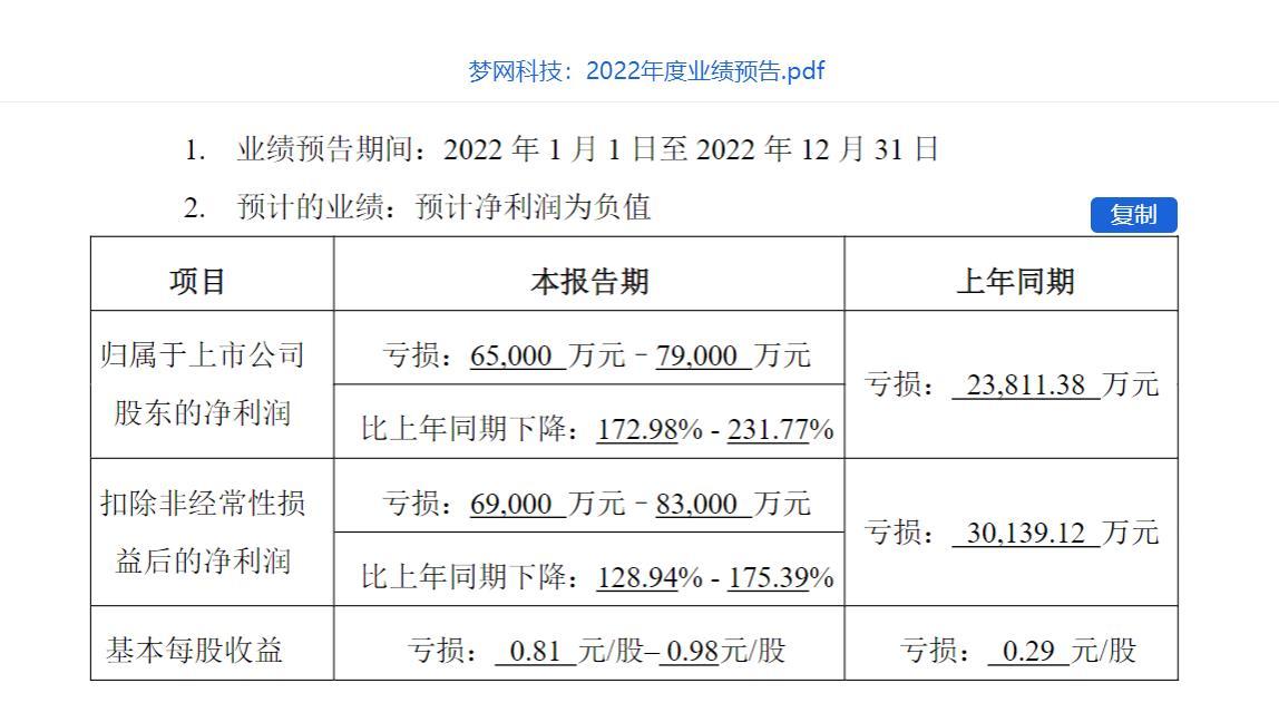 根据其此前披露的2022年业绩预告,2022年,梦网科技继续亏损,亏损范围在6.5亿元~7.9亿元;上年同期为亏损2.38亿元,已连续亏损两年,且金额进一步扩大。