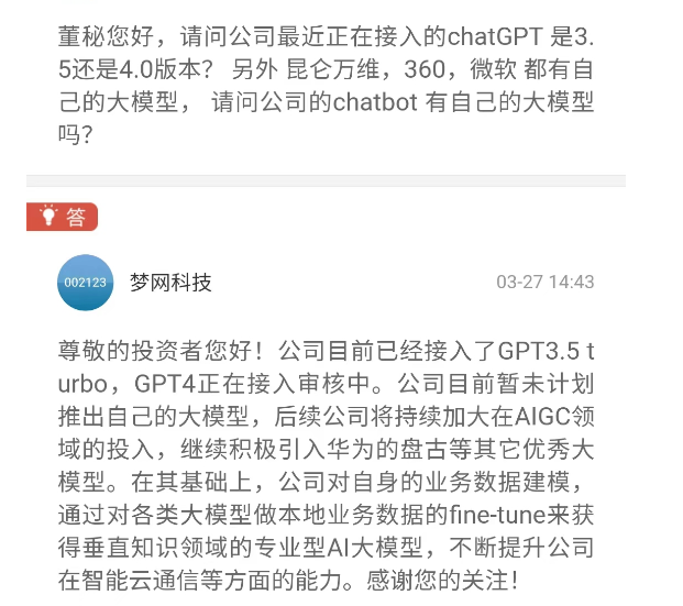 临近收盘(3月27日14:43),梦网科技又接连放出几条重磅消息:“公司目前已经接入了GPT3.5 turbo,GPT-4正在接入审核中。”根据梦网科技的说法,公司目前暂未计划推出自己的大模型,后续将持续加大在AIGC领域的投入,引入华为的盘古等其他优秀大模型。