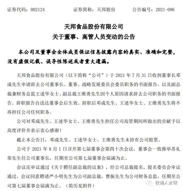 8月1日晚间,天邦股份发布公告称,7月31日,公司收到董事长邓成申请辞去公司董事长、董事、战略发展委员会委员职务的书面报告,以及副总裁兼财务总监王述华、副总裁王维勇因个人原因请求辞去公司职务的书面报告。
