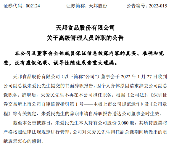 近日,天邦股份接连发布两则公告,宣布公司副总裁朱爱民、严小明因个人原因,辞去副总裁职务。朱永胜接替副总裁职位。