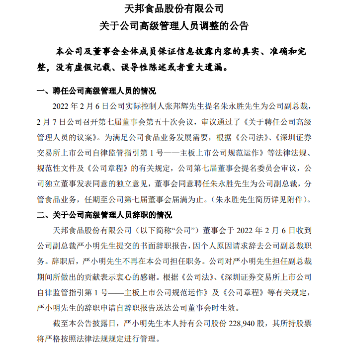 2022年2月6日公司实际控制人张邦辉先生提名朱永胜先生为公司副总裁,2 月 7 日公司召开第七届董事会第五十次会议,审议通过了《关于聘任公司高级管理人员的议案》。公司第七届董事会提名委员会审议,公司独立董事发表同意的独立意见,董事会同意聘任朱永胜先生为公司副总裁,分管食品业务,任期至公司第七届董事会届满为止。