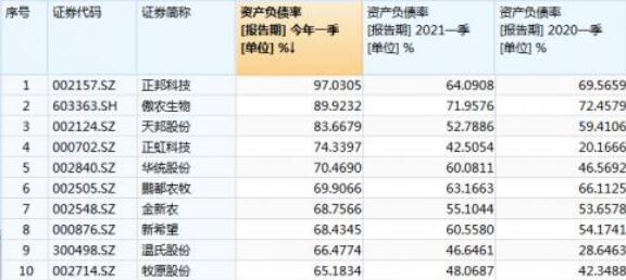 今年6月初正邦科技曝出5亿元商票逾期时,21世纪经济报道曾指出,一季度末正邦科技资产负债率达到97%,而同期上市猪企中,负债率仅次于正邦科技的正是傲农生物、天邦股份,当期两家负债率分别为89.9%和83.7%。