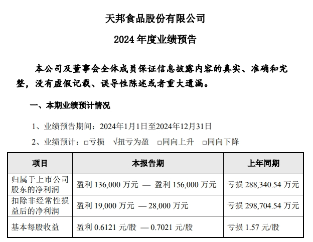 1月7日晚间,ST天邦发布业绩预告,预计2024年归属于上市公司股东的净利润13.6亿元—15.6亿元,实现扭亏为盈。