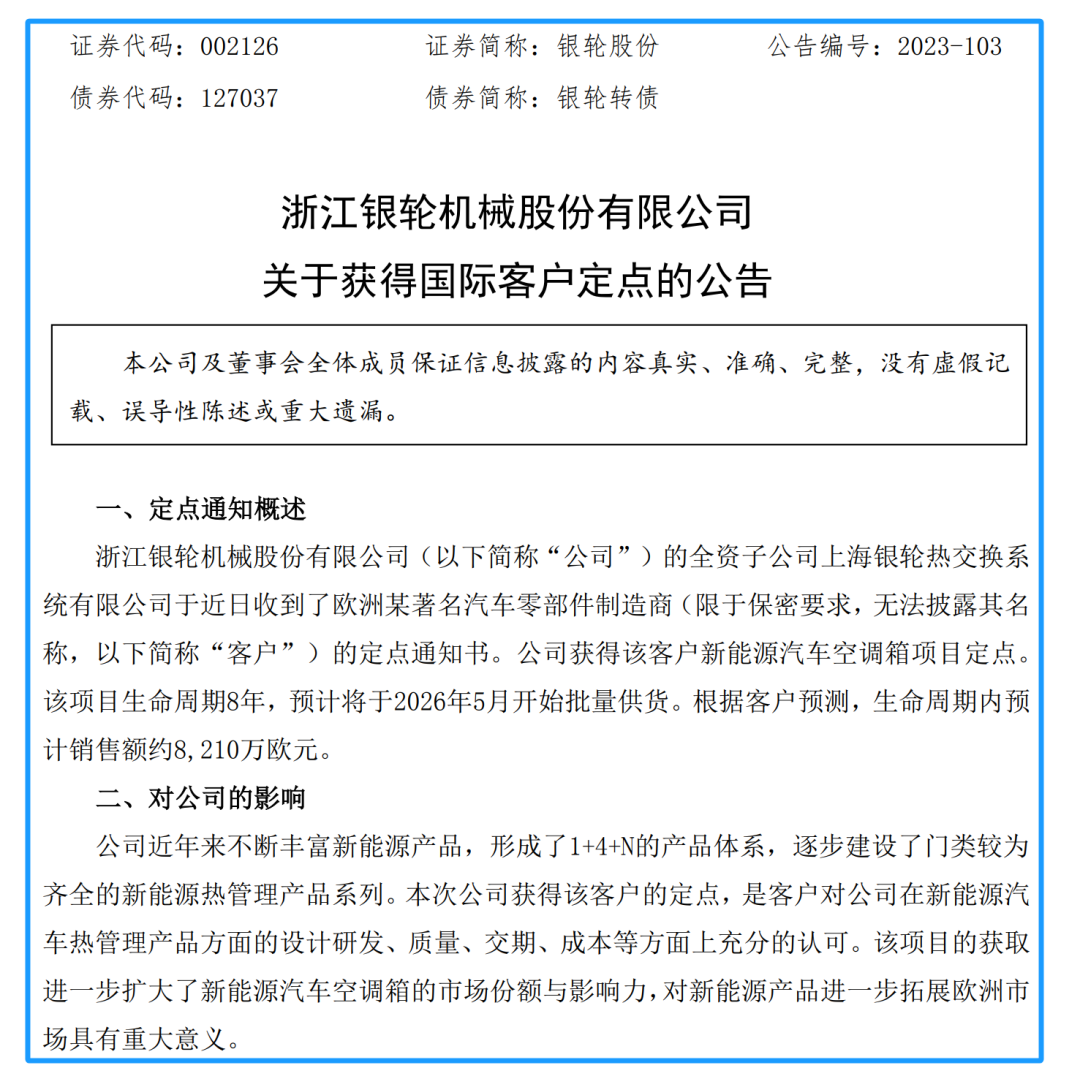12月20日晚,银轮股份公告,公司全资子公司上海银轮热交换系统有限公司于近日收到欧洲某著名汽车零部件制造商的定点通知书,公司获得该客户新能源汽车空调箱项目定点,该项目生命周期8年,预计将于2026年5月开始批量供货,根据客户预测,生命周期内,预计销售额约8210万欧元。