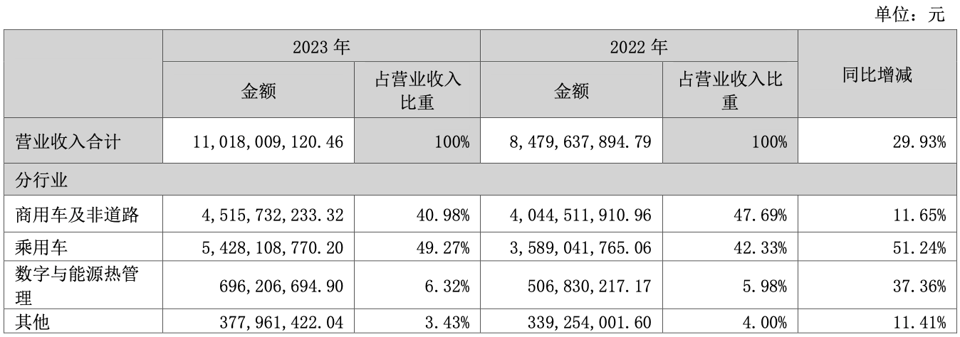 推动公司商用车非道路、乘用车、数字与能源管理以及其他业务2023年营收分别同比增长11.65%、51.24%、37.36%、11.41%至45.16亿元、54.28亿元、6.96亿元、3.78亿元,营收总规模同比增长29.93%至110.18亿元。