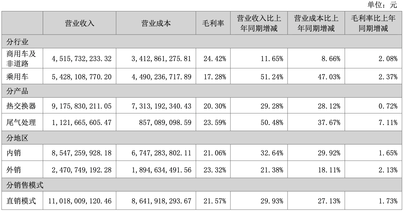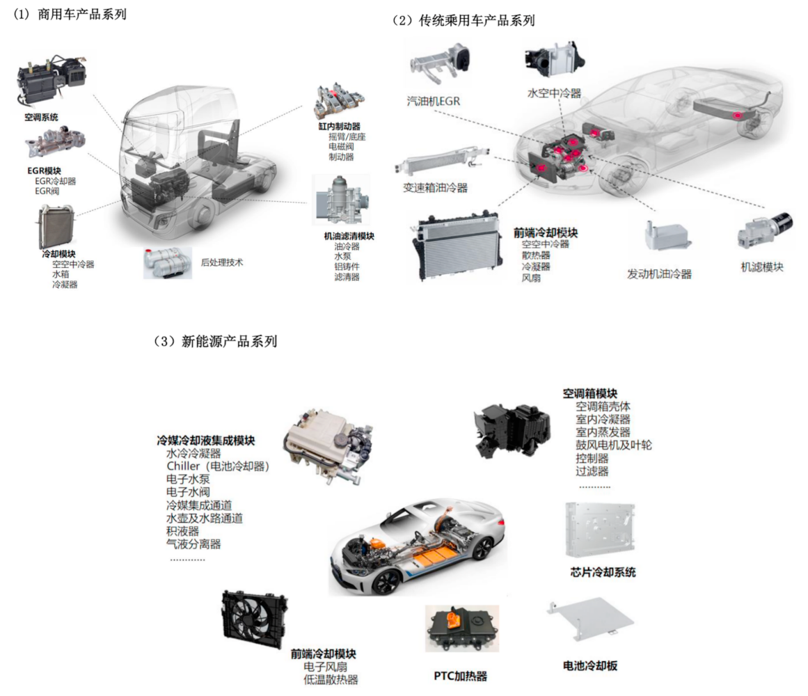 产品配套领域同样广泛,目前主要配套商用车、乘用车、新能源、工程机械、农业机械、压缩机、风力发电、火车机车、轮船等领域。公司还在拓展智能驾驶、通讯基站、数据处理中心、光伏储能等新兴领域热管理业务,为公司业务长期可持续增长提供了广阔空间。