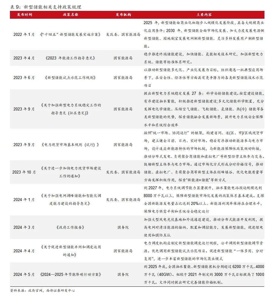 政策驱动新型储能商用化,行业景气度持续升温。2022年1月,发改委和国家能源局发布《“十四五”新型储能发展实施方案》明确提出,2025年新型储能由商业化初期步入规模化发展阶段,具备大规模商业化应用条件,到2030年实现新型储能全面市场化发展。在实现“双碳”目标背景下,2023年以来,国家层面连续出台一系列新型储能多元化、产业化支持政策,带动行业景气度持续升温。根据最新国务院发布《2024—2025年节能降碳行动方案》指引,目标到2025年底,国内新型储能装机规模达到40GW,较2021年政策要求提高33%。