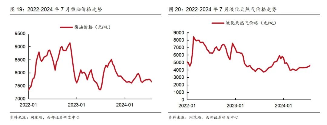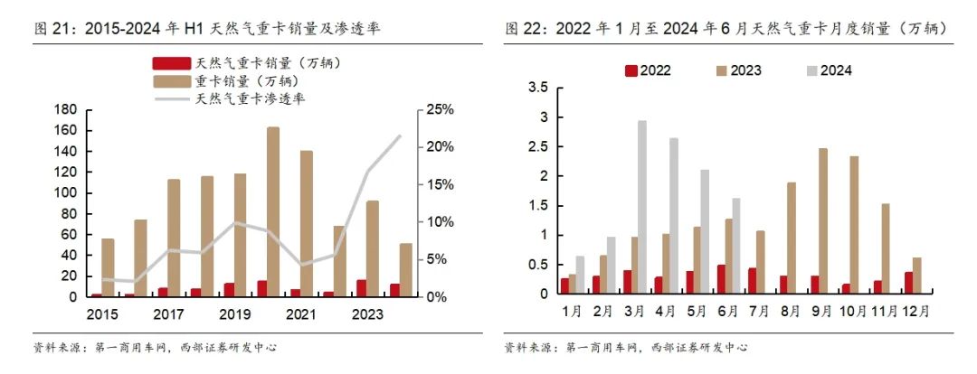 重卡行业结构调整,天然气重卡渗透率加速提升。重卡行业燃料成本占整体运营成本40%,因此重卡用户对于燃料成本敏感度较高。2023年以来,天然气价格持续走低、下半年柴油价格高企,推动重卡用户倾向置换或新购天然气重卡。2023年天然气重卡全年实现销量15万辆,同比+307%,重卡市场渗透率达16.7%,同比+11.1pcts;2024年1-6月,天然气重卡实现销量10.9万辆,同比+104%,重卡市场渗透率达21.6%,销量持续保持高增,市场结构加速向天然气重卡转型升级。