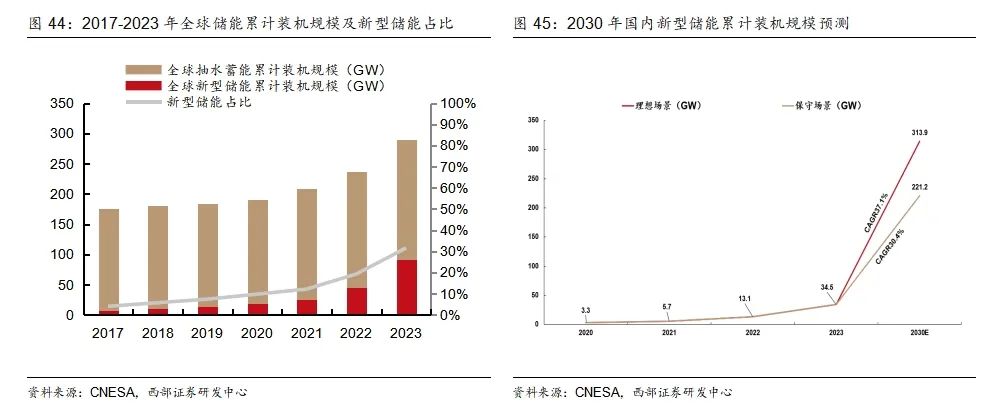 全球新型储能装机规模占比持续提升,2030年国内累计装机规模有望突破300GW。根据CNESA统计,截至2023年底,全球已投运电力储能项目累计装机规模达289.2GW,较前一年末增长22%,其中新型储能累计装机规模达91.3GW,较前一年末实现翻倍,占总规模比重32%,同比+12.3pcts;国内已投运电力储能项目累计装机规模达86.5GW,占全球市场总规模30%,其中新型储能累计装机规模达34.5GW,较前一年末增长164%。根据CNESA测算,预计在理想场景下(定义未来几年中国新能源加速发展),预计2030年国内新型储能累计装机规模有望达到313.9GW,2023-2030年CAGR达37%,呈现快速增长态势;预计在保守场景下(定义为政策执行、成本下降、技术改进等因素未达预期的情形),预计2030年国内新型储能累计装机规模有望达到221.2GW,2023-2030年CAGR达30%。