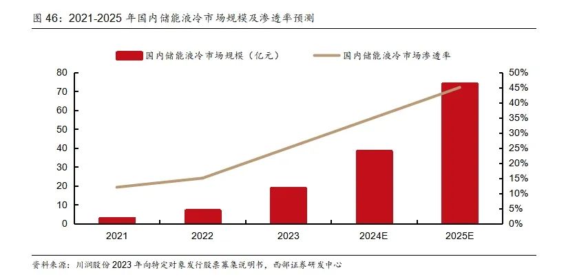 新型储能规模扩容+液冷方案渗透率提升,预计2025年国内储能液冷市场规模将达到74亿元。根据观研报告,2021年我国储能液冷市场规模3亿元,预计2025年市场规模将达到74亿元,2021-2025年CAGR达123%,对应液冷市场渗透率由2021年12%提升至2025年45%。
